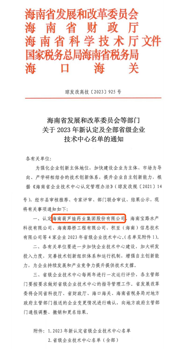 近日,海南省发改委等多部门联合公布了《关于2023年新认定及全部省级企业技术中心名单的通知》,其中,海南尊龙人生就是傅药业集团股份有限公司成功通过评审,被认定为省级企业技术中心,是本次获批的4家企业之一。